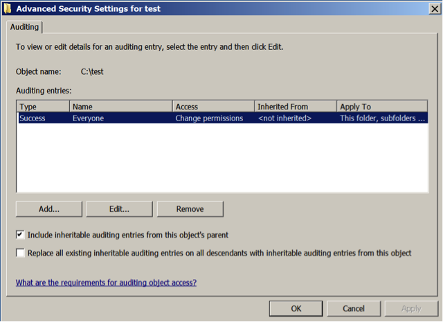 First we need to enable the File System audit subcategory. You’ll find this policy in any group policy object under Computer Configuration\Windows Settings\Security Settings\Advanced Audit Policy Configuration\System Audit Policies\Object Access. Enable File System for success. (By the way, make sure you also enable Computer Configuration\Windows Settings\Security Settings\Local Policies\Security Options\Audit: Force audit policy subcategory settings to override audit policy category settings to make sure your audit policy takes effect. Now you need to enable object level auditing on the root folders containing your unstructured data. For instance if you have a shared folder called c:\files, go to that folder in Windows Explorer, open the security tab of the folders properties, click Advanced and select the Auditing tab. Now add an entry for Everyone that enables successful use of the Change permissions as shown below.
