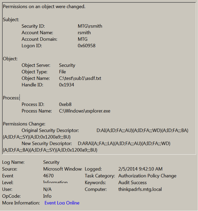 At this point Windows will begin generating 2 events each time you change permissions on this folder or any of its subfolders or files. One event is the standard event ID 4663, “An attempt was made to access an object”, which is logged for any kind of audited file access like read, write, delete, etc. That event will show WRITE_DAC under the Access Request Information but it doesn’t tell you what the actual permission change was. So instead, use event ID 4670, “Permissions on an object were changed”, which provides the before and after permissions of the object under Permissions Change as shown in the example below.