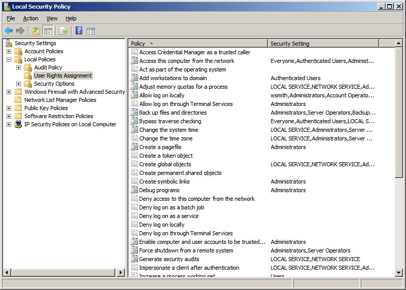 of the user rights that you find in the Local Security Policy under Security