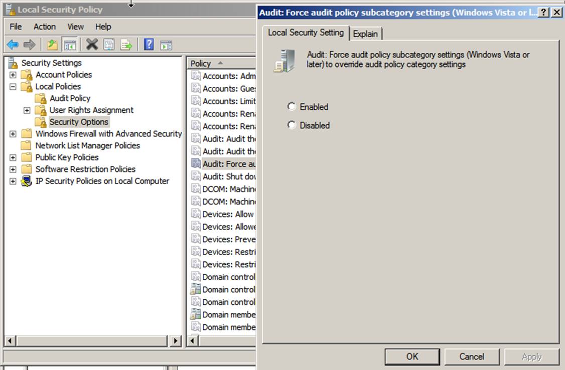 enabling the Audit: Force audit policy subcategory settings (Windows Vista